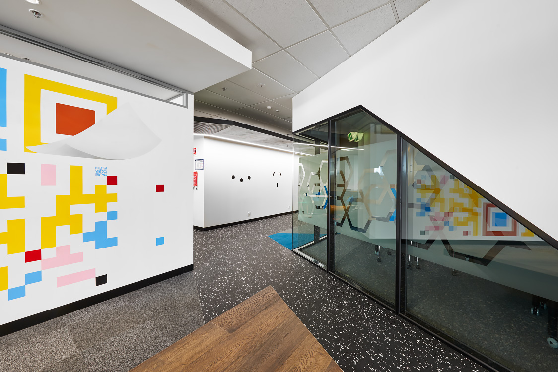 QR WALL riffs off and exaggerates the vivid colouring and use of repetition throughout the building to create a focal point in the student social space